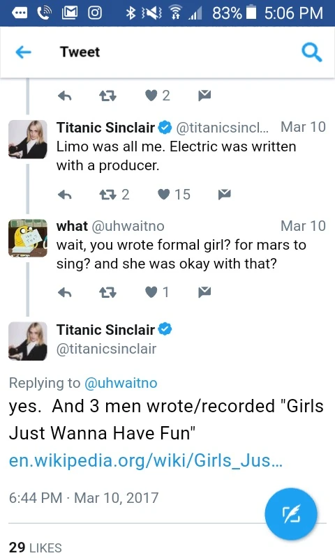 - ↑ Titanic Sinclair (March 10, 2017). "Limo was all me. Electric was written with a producer". Twitter. Archived from the original. Retrieved May 12, 2022.