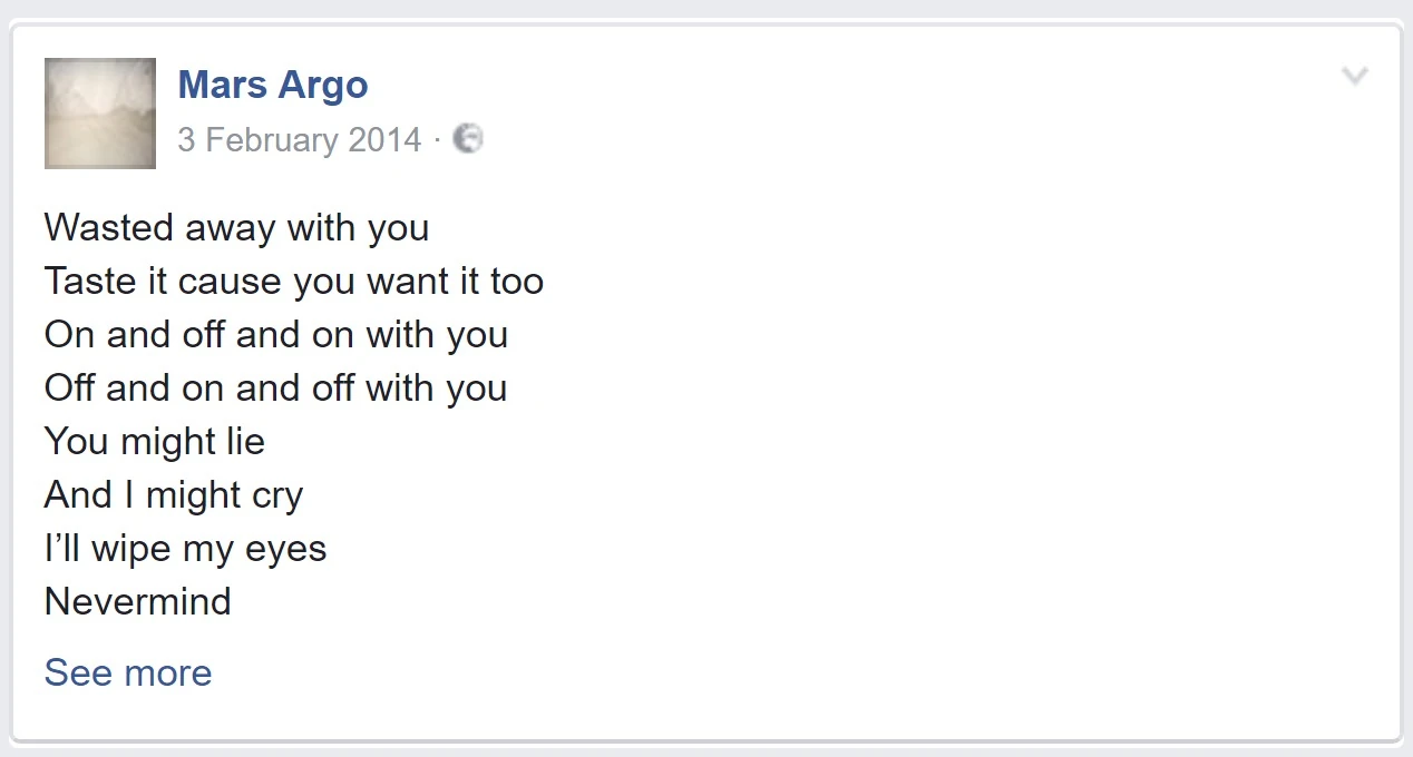 - ↑ Mars Argo (February 3, 2014). "Wasted away with you... (cont.)". Facebook. Archived from the original on April 23, 2017. Retrieved May 13, 2022.